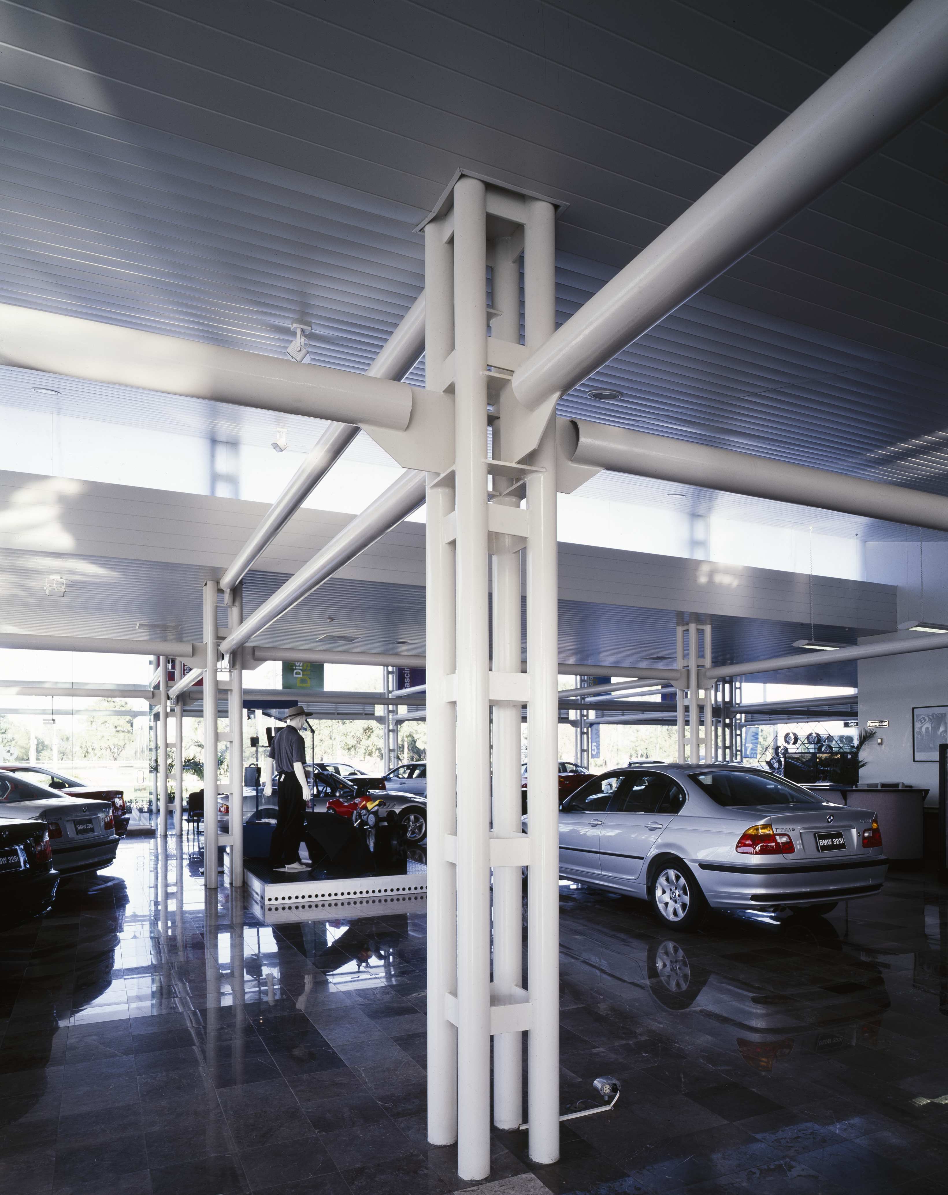La agencia BMW se diseñó bajo conceptos arquitectónicos de flexibilidad y transparencia, con un edificio de planta libre y una estructura geométrica. La retícula de siete por siete metros integra funciones de venta, exhibición y servicio sin segregarlas, generando una experiencia continua para el usuario. Se utilizaron materiales homogéneos en el interior y exterior, creando una imagen de ligereza y transparencia. Las cubiertas inclinadas responden al clima, permitiendo una construcción rápida sin sacrificar la calidad, mientras que su diseño refleja una estética tecnológica y contemporánea.